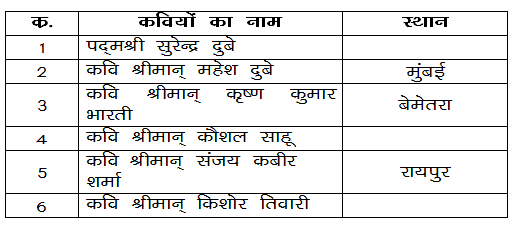 संस्था द्वारा कार्यालय कलेक्टर जिला राजनांदगांव (छ.ग.) कार्यादेष क्रमांक 5334/ज्ये. लि. - 2/2018 राजनांदगांव, दिनांक 02.06.2018 कवि सम्मेलन संचालनालय, संस्कृति एवं पुरातत्व रायपुर द्वारा कार्यक्रम आयोजन किया गया है। सभी राजनांदनां कवि सम्मेलन का आयोजन सफलतापूर्वक किया गया।